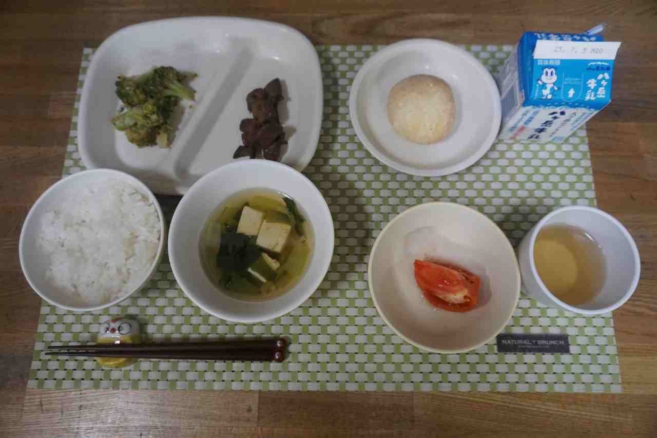ご飯 レバーの甘辛煮 ブロッコリーのごま酢和え みそ汁