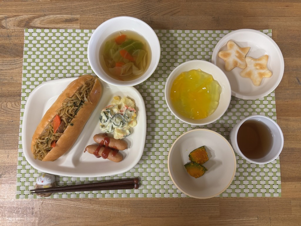 | お昼 | 焼きそばパン ボイルウインナー ポテトサラダ キャベツのスープ |