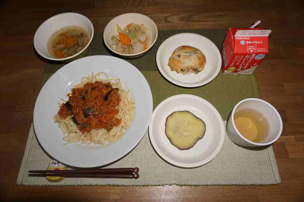 なすのミートソーススパゲティ ツナキャベツ きのこのスープ