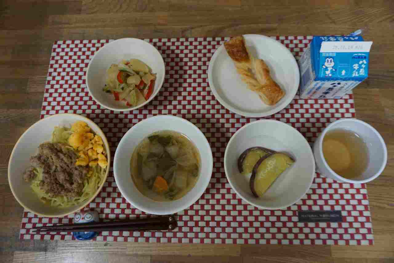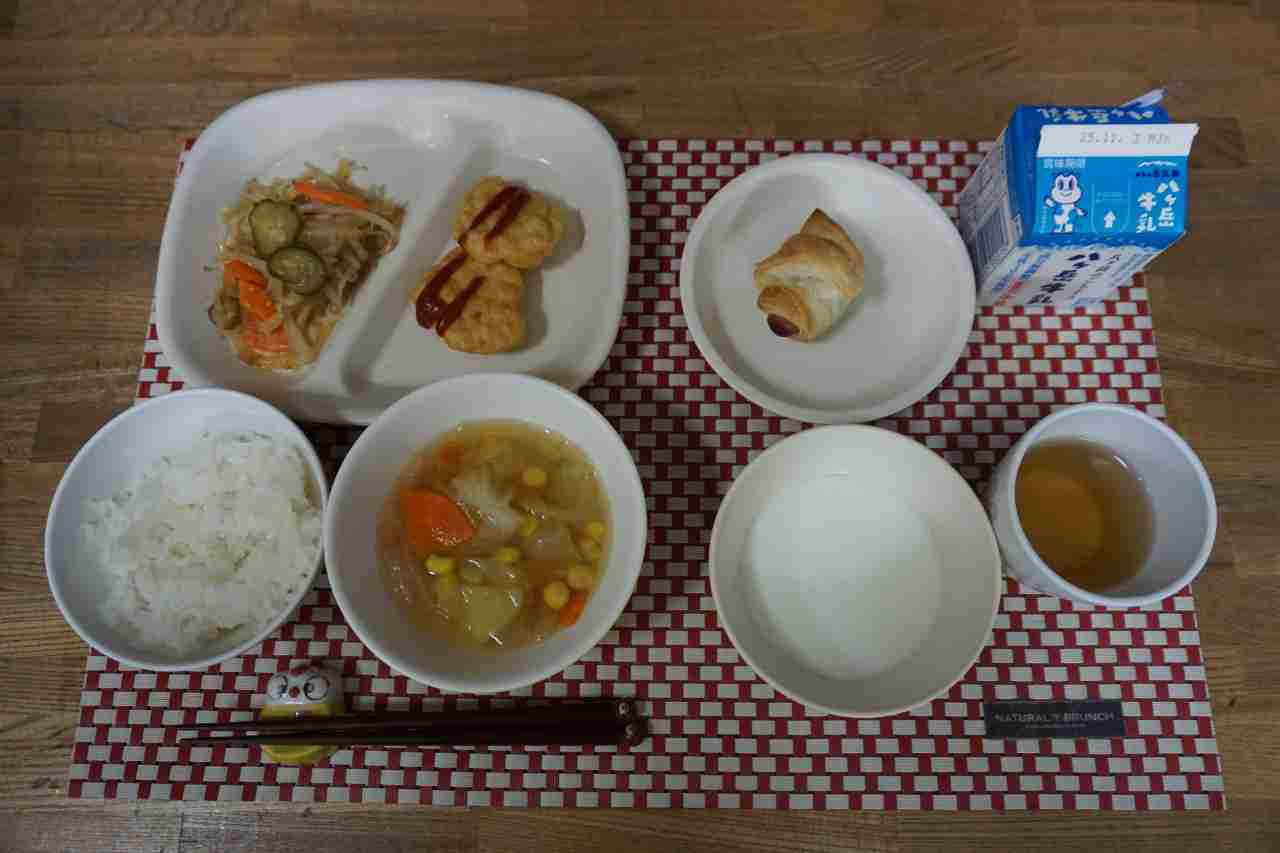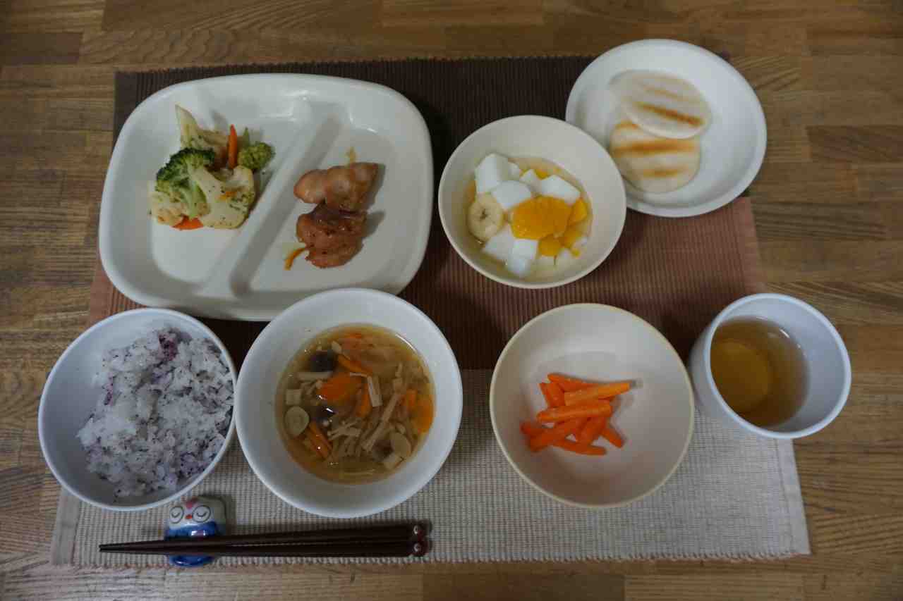 ご飯 チキンナゲット もやしのサラダ 野菜たっぷりスープ