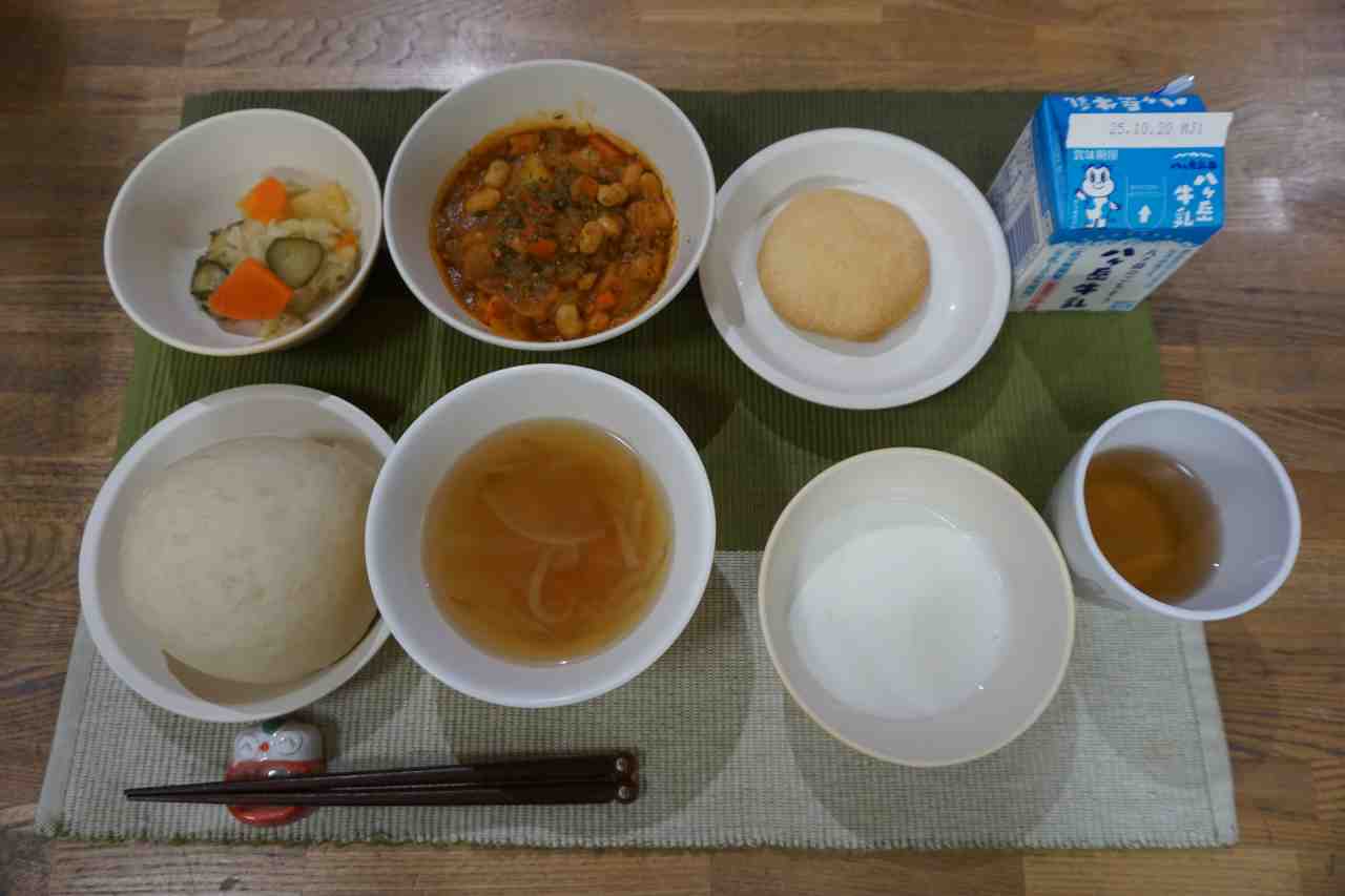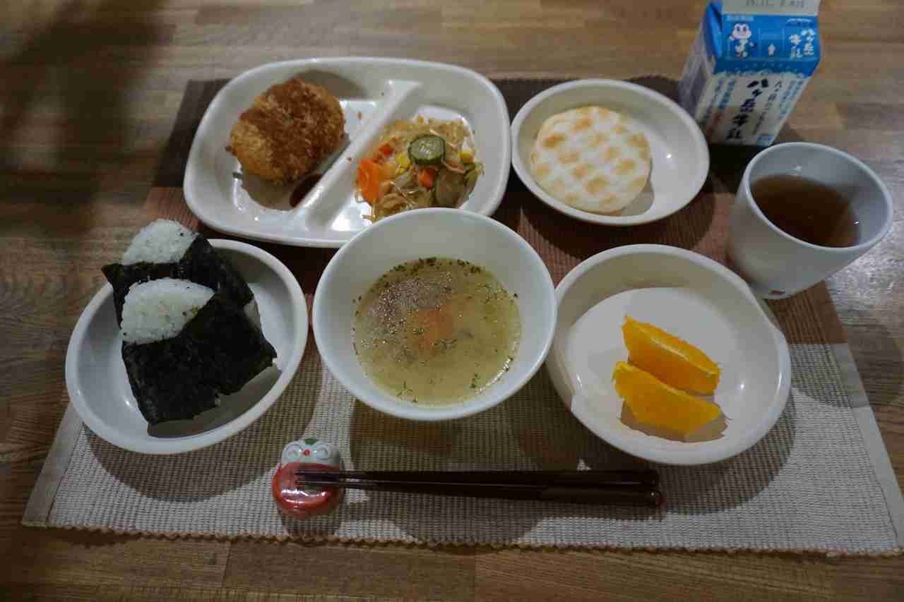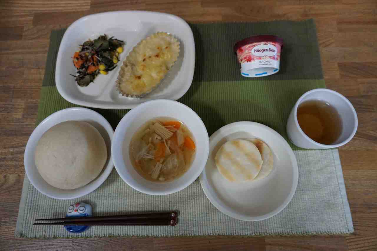 ご飯 チキンナゲット もやしのサラダ 野菜たっぷりスープ