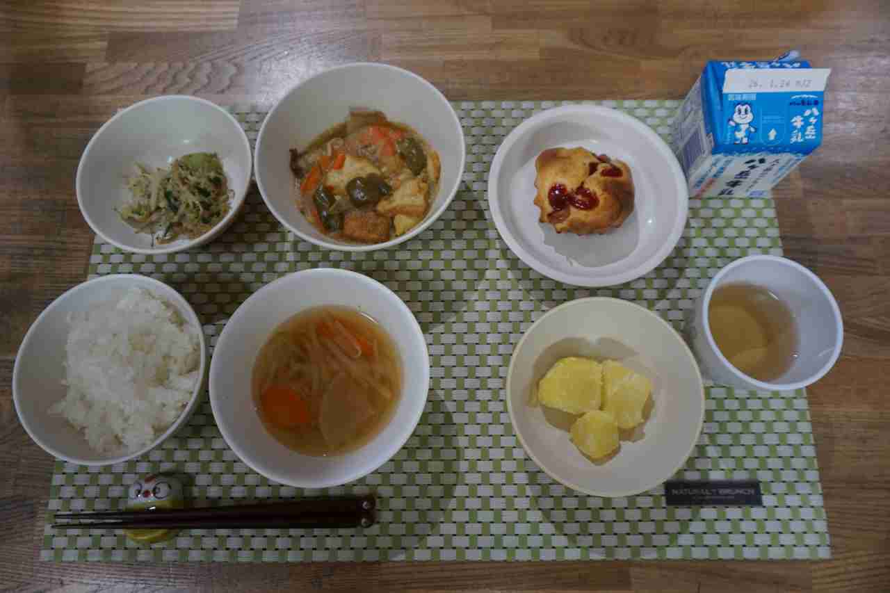 ご飯 厚揚げの中華煮 チンゲン菜のしらす和え もやしのスープ
