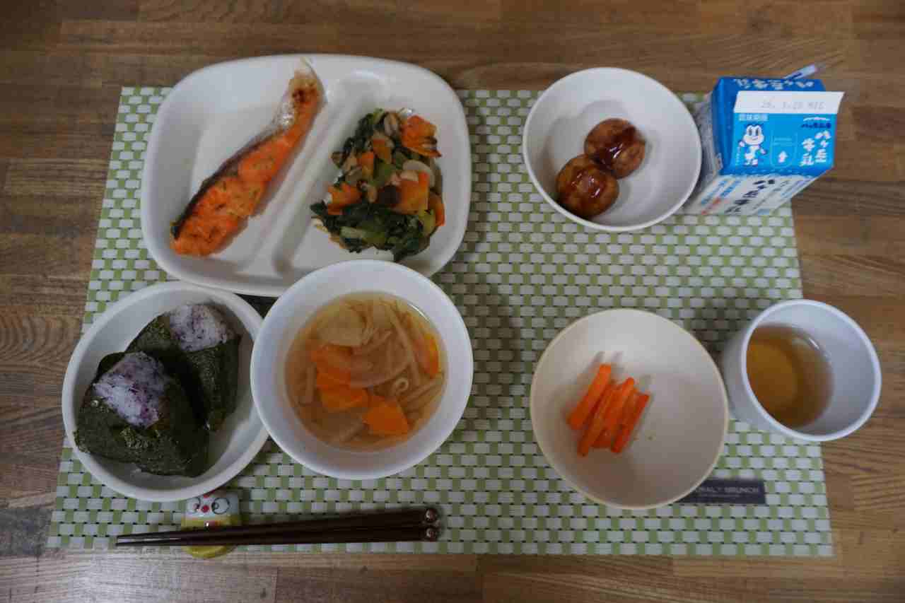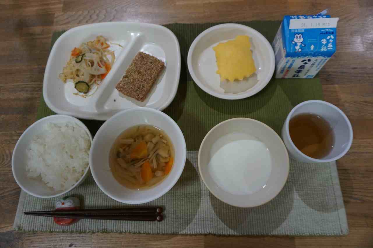 | お昼 | とりごぼうご飯 キャベツとツナの甘酢和え 長芋の豆乳入りみそ汁 |